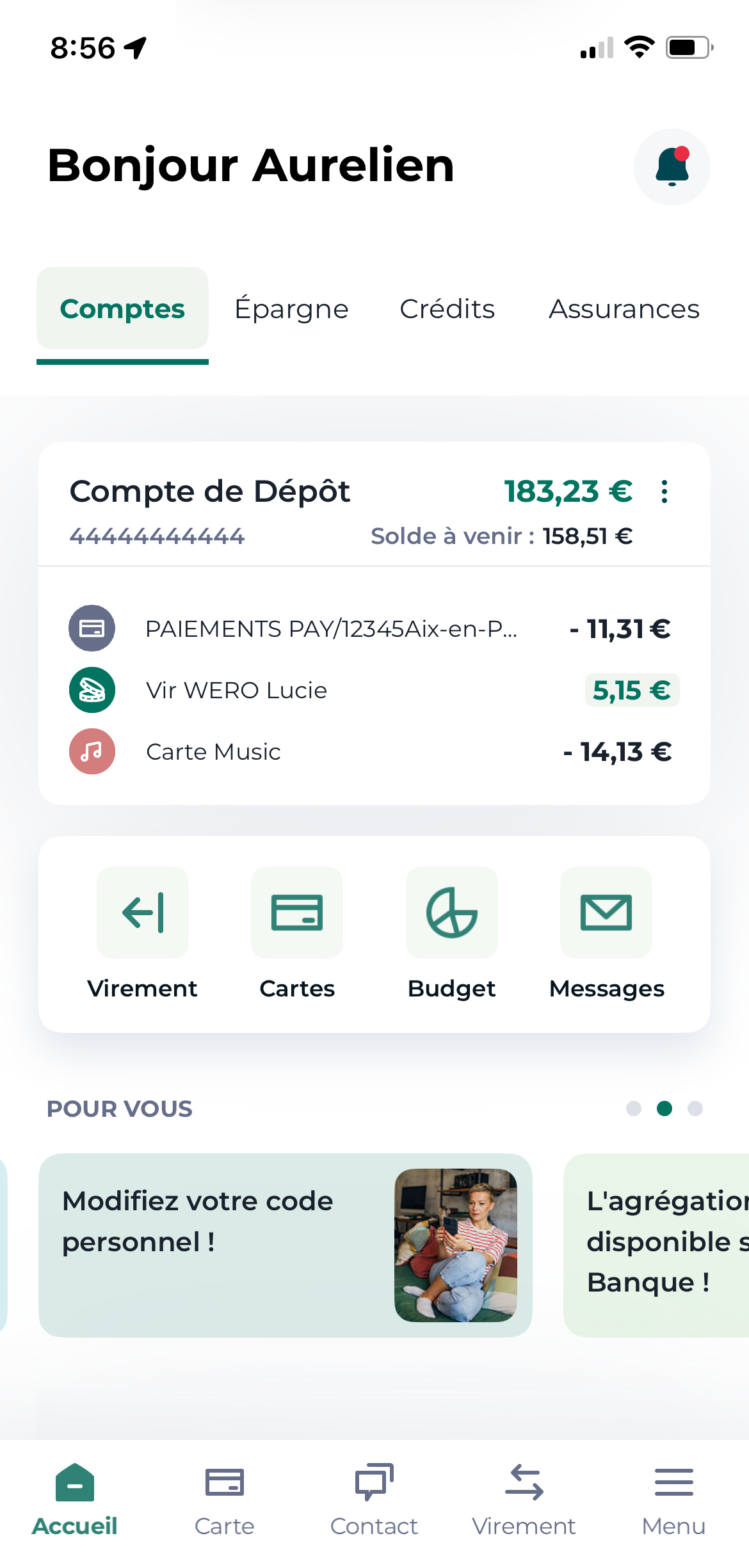 Connectez vous à l'application Ma Banque et appuyez sur "Menu" en bas de la page